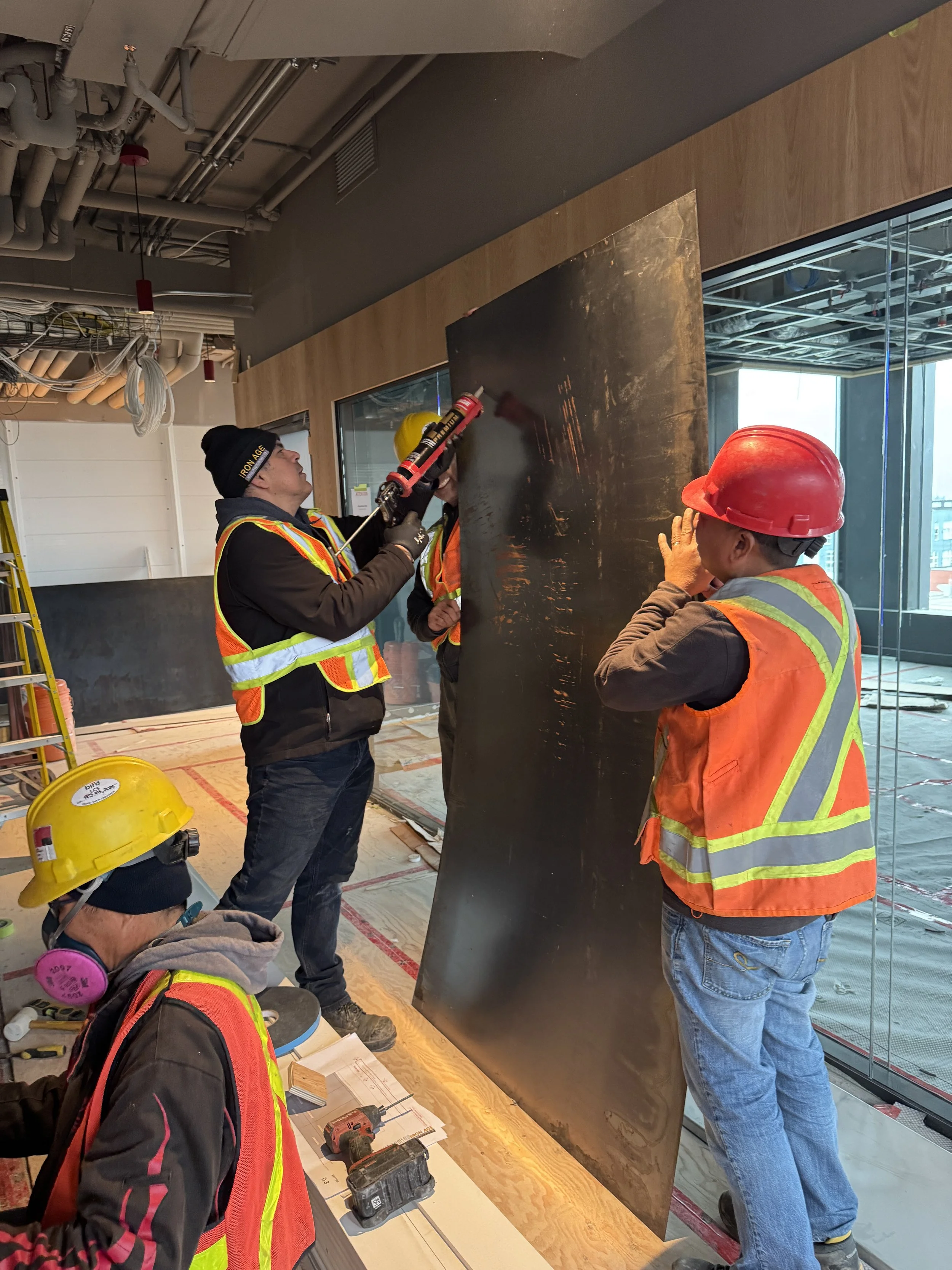 Modern commercial interiors are increasingly turning toward metal finishes to achieve a clean, contemporary aesthetic. One of the most sought-after options is blackened steel wall cladding — a material that offers depth, durability, and a refined architectural presence. At Iron Age Manufacturing, we recently completed the installation of custom-fabricated blackened steel wall panels for a high-end commercial space. This project highlights our team’s expertise in both fabrication and on-site installation, ensuring every panel aligns perfectly for a seamless finish.