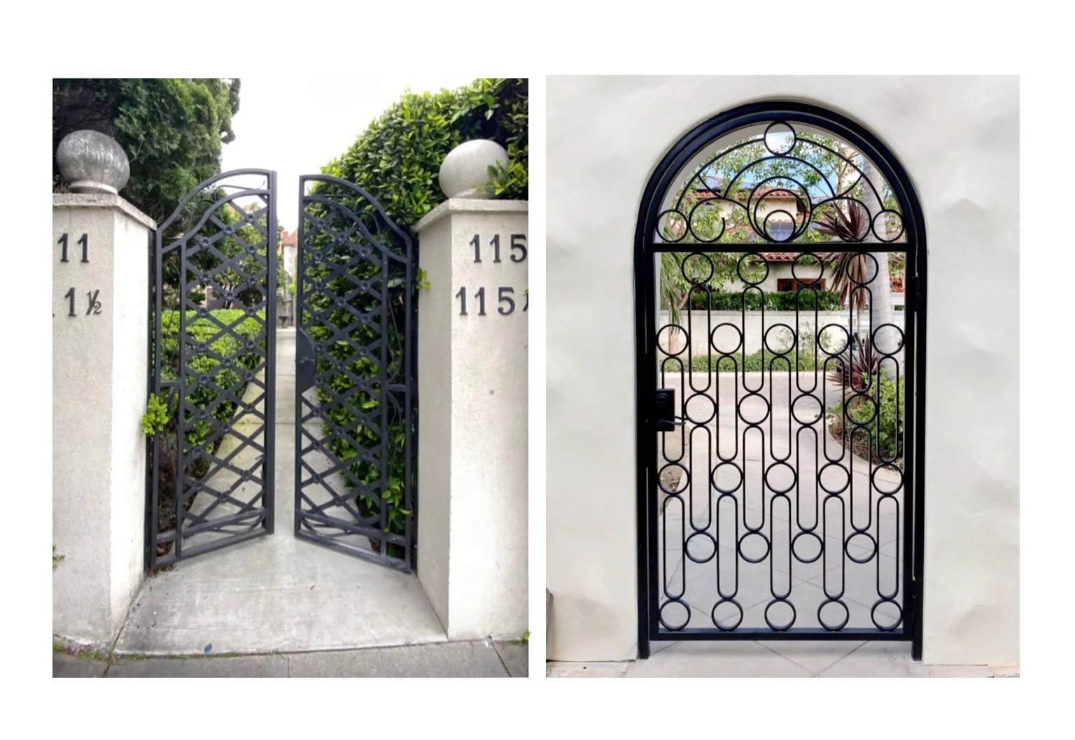 Traditional wrought iron gates often include arches, scrolls, and decorative motifs such as circles, ovals, or floral elements — reminiscent of Parisian courtyards and Italian villas.